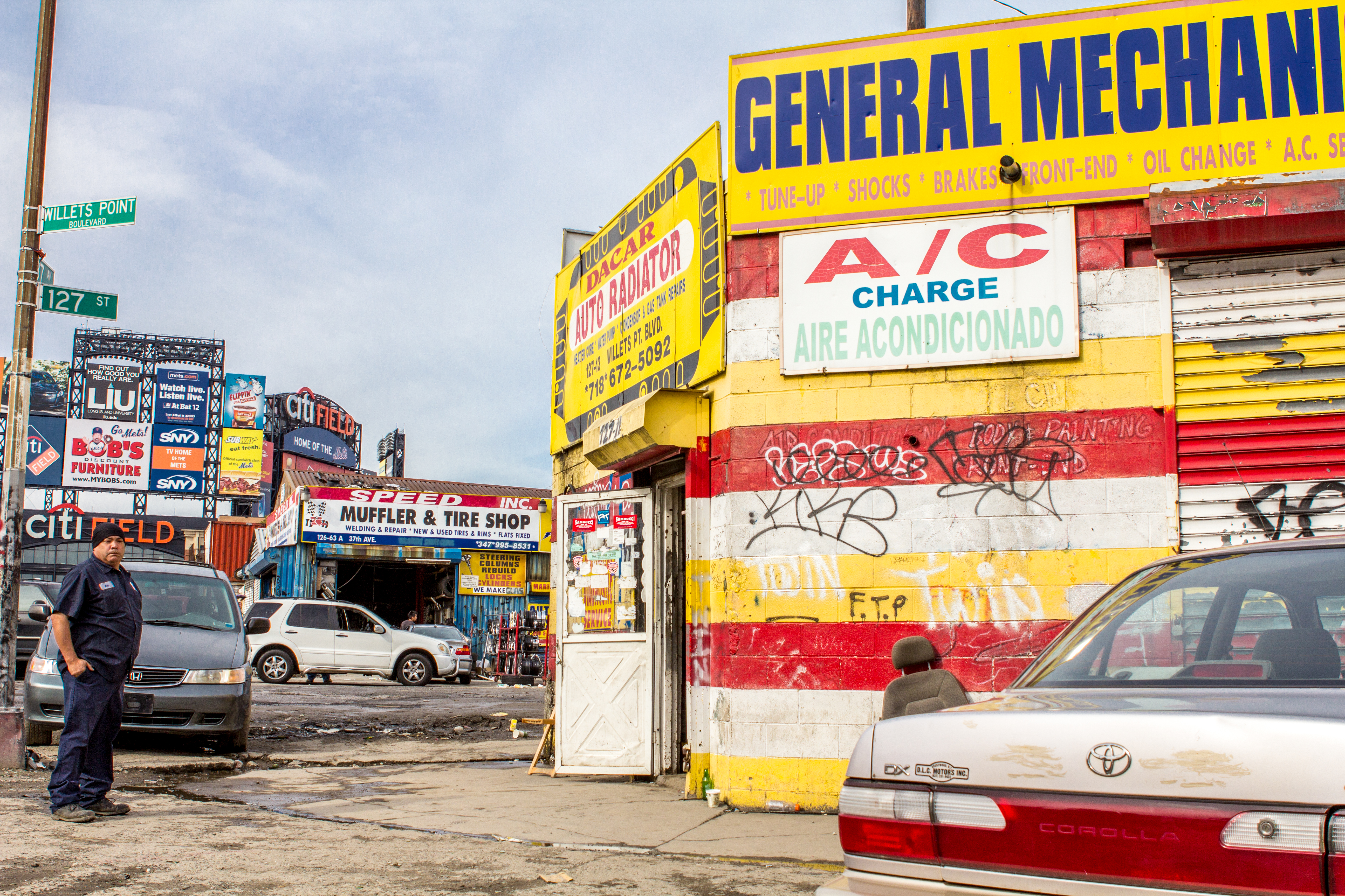 During a visit to NY this past Monday, my mom and I drove through Willets Point to get some estimates for auto-body work. Willets Point is a massive collection of junk yards, auto-body shops and mechanics that’s in the backyard of the new Citi Field where the Mets play. This New York Times article talks about the history of Willets Point and all the controversy around it with the city wanting to take over the area to build condos, shops, hotels, etc. Willets Point is absolutely fascinating. It is a world of its own. I only had about 5 minutes to jump out of the car and take a few pictures, but I could have easily spent the day there documenting all that was going on. – October 8, 2012